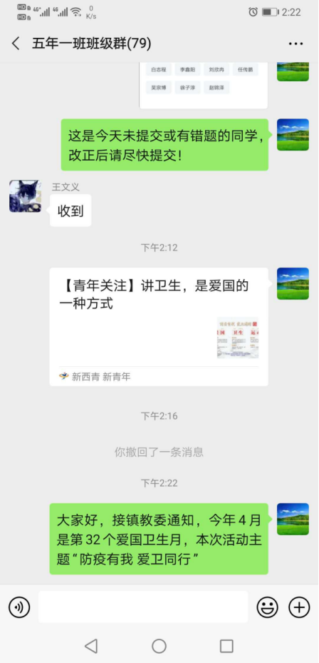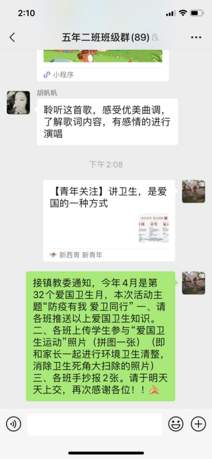 学校通过班级微信群,推送了有关爱国卫生知识,发出了《爱国卫生月活动倡议书》,鼓励全体学生弘扬爱国主义,树立健康强国理念。